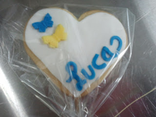 Tras tener claro todo lo que quería transmitir con la galleta, lo primero fue decidir su forma. No quería las típicas como pueden ser un carrito, un biberón o un body, elegí un CORAZÓN pues para mí, además de representar al amor es símbolo de vida como lo es la llegada al mundo de un bebé. Lo cubrí de fondant BLANCO pues significa PUREZA como lo es cualquier bebé, puro. Tenía claro que su nombre aparecería en el diseño pues es su identificación, además de que es muy bonito y transmite personalidad, LUCAS, y lo transcribí en AZUL pues representa al sexo masculino. Quedaba el toque final, y como no, fueron mis queridas MARIPOSAS las protagonistas de ocupar la otra parte del diseño pues para mí representan la BELLEZA y la LIBERTAD, como lo es Lucas, bello y libre.